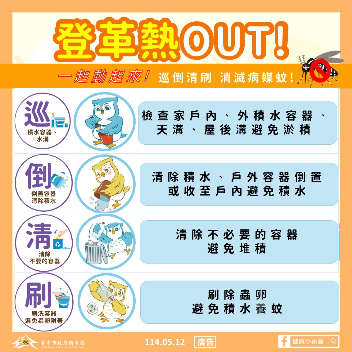 呼籲民眾主動參與孳生源清除工作,落實定期「巡、倒、刷、清」四步驟,才能有效降低登革熱疫情。