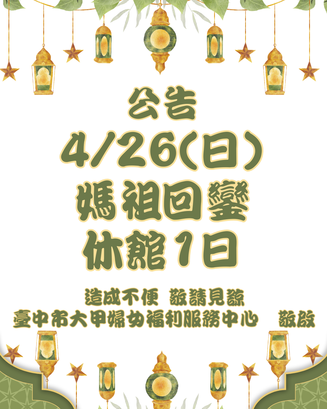 [公告] 4/26(日) 媽祖回鑾 休館一天