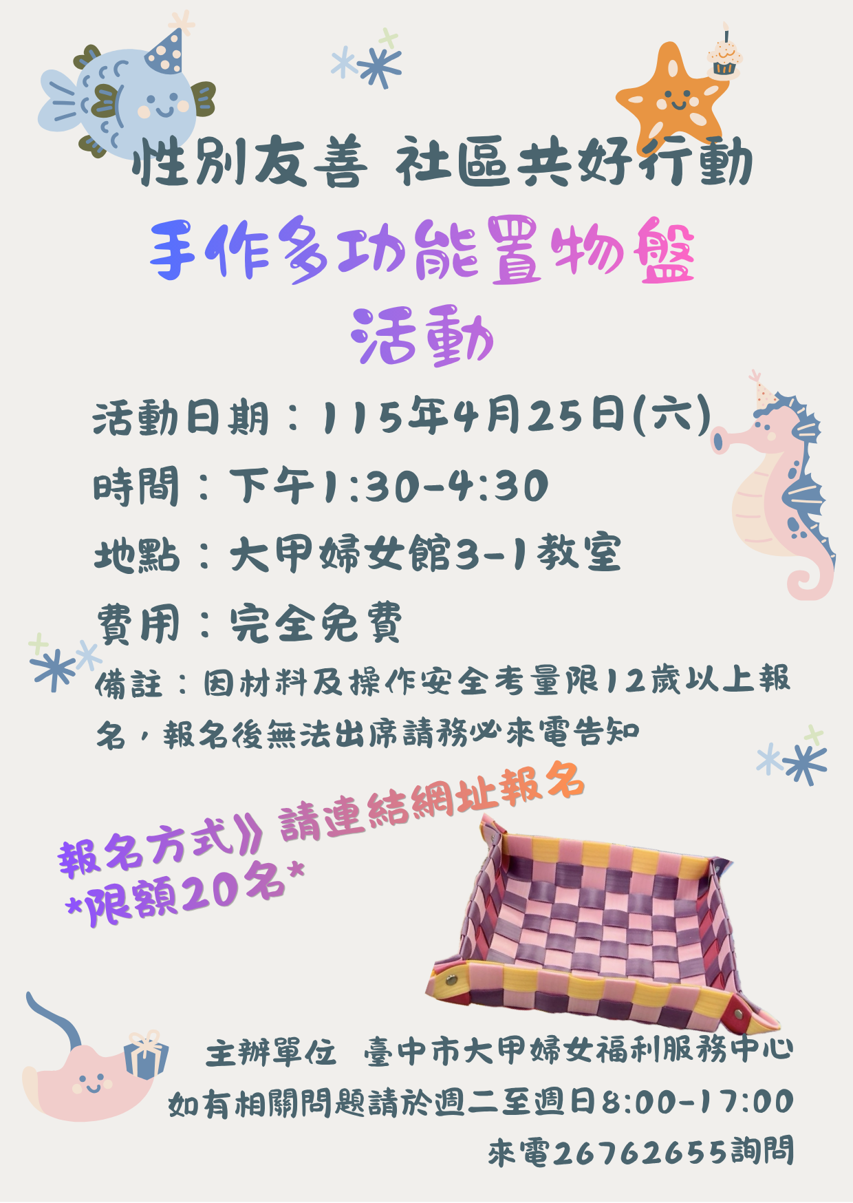 備註:因材料及操作安全考量限12歲以上報名,報名後無法出席請務必來電告知