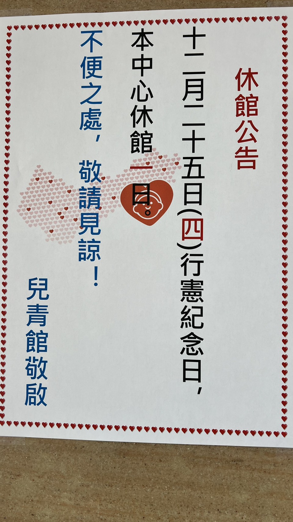 【休館公告】兒青館~🎇12/25行憲紀念日🎇~📢休館公告📢