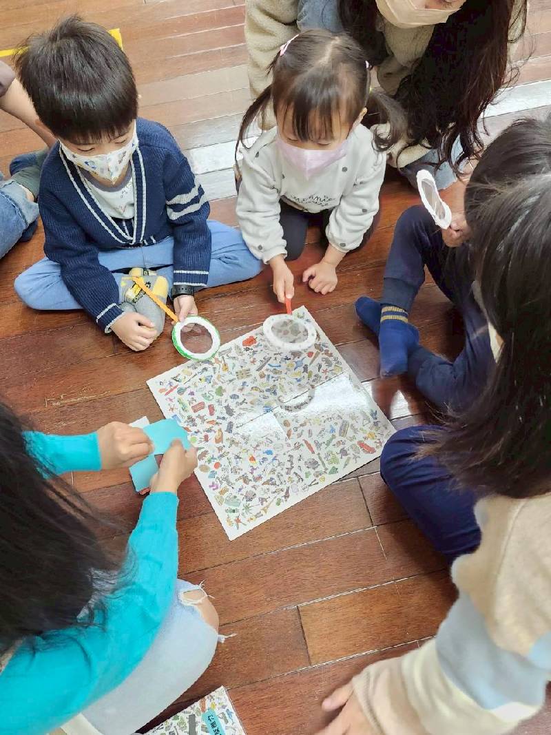 創意手作: 這次用撕貼畫的方式呈現作品,小朋友用手指把色紙撕成片,再貼在圖畫紙上,貼成神探狗汪汪的樣子。我們還做了神探必備的放大鏡,運用透明片和冰棒棍,每位小朋友的放大鏡都有不一樣的花色呢!