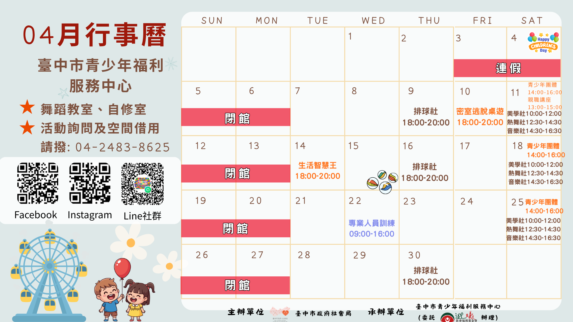 📍活動地點:臺中市青少年福利服務中心(臺中市大里區新光路32號5樓)